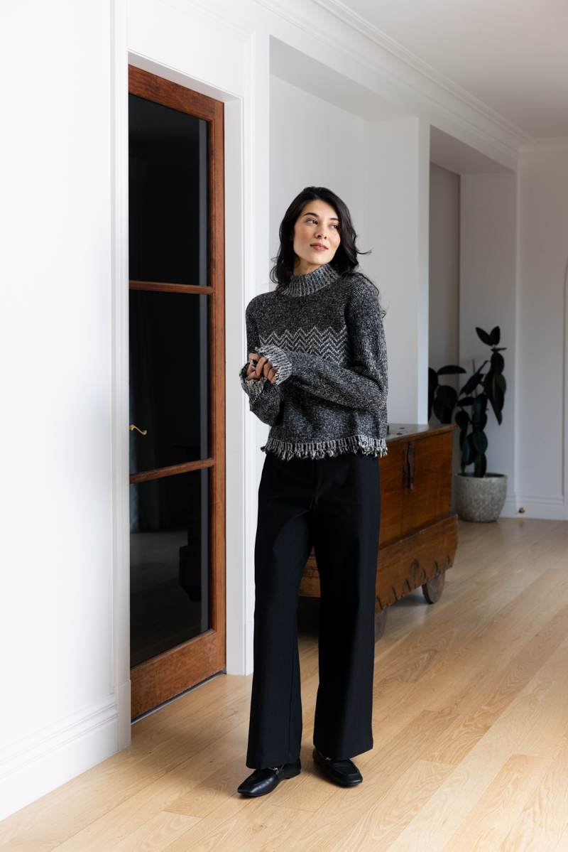 Patterned knit with fringe hem detail.