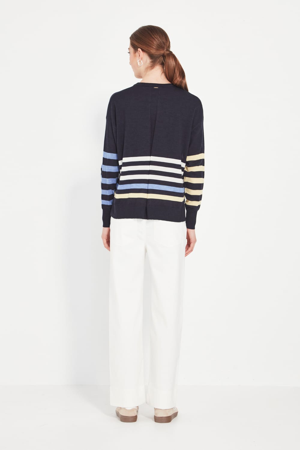 The Thea Sweater brings a graphic, modern twist to classic Merino. Designed with a clean crew neckline and soft 100% Merino wool, it delivers lightweight warmth with a smooth, refine style.